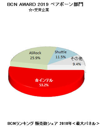 【BCN AWARD 2019・喜びの声】 全国の主要家電量販店・ネットショップのPOSデータを集計した「BCNランキング」のベアボーン部門で、2018年1月~12月の1年間の販売台数シェアNo.1だったメーカーはインテルだった。5年連続5回目の受賞となり、ベアボーン部門で盤石の地位を確保している。