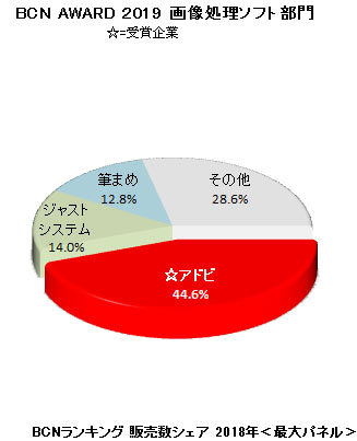 【BCN AWARD 2019・喜びの声】 全国の主要家電量販店・ネットショップのPOSデータを集計した「BCNランキング」の「画像処理ソフト部門」で、2018年1月~12月の1年間の販売台数シェアNo.1に輝いたメーカーは、アドビシステムズだった。17年連続17回目の受賞になる。