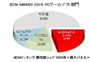 【BCN AWARD 2019・喜びの声】 全国の主要家電量販店・ネットショップのPOSデータを集計した「BCNランキング」の「PCゲームソフト部門」で、2018年1月~12月の1年間の販売台数シェアNo.1に輝いたメーカーは、スクウェア・エニックスだった。2年連続5回目の受賞になる。