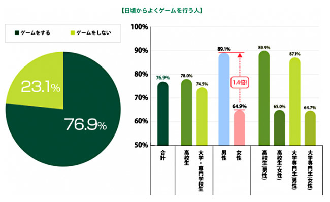 「日頃からよくゲームをしますか?」との問いに対して、アンケート回答者のおよそ4人に3人の76.9%が日頃からゲームを楽しんでいるという。高校生(78.0%)と大学・専門学校生(74.5%)でほぼ同率なのに対し、男性(89.1%)が女性(64.9%)の約1.4倍。ゲームは、男性に圧倒的な人気がある。