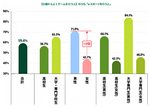 また、「日頃からよくゲームをする」と回答した人に「eスポーツはしますか?」と質問したところ、半数以上の59.4%だったという。若者の間でeスポーツの認知度が高まっているとのことだ。
