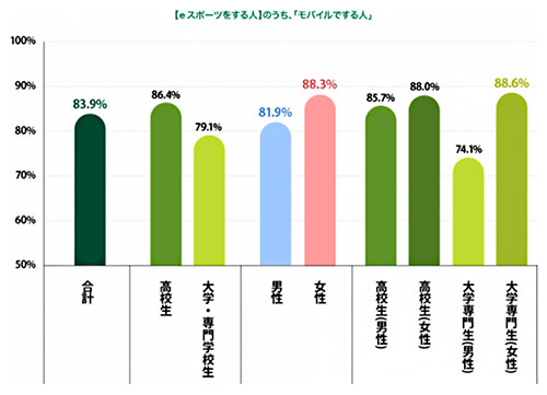興味深いのは、eスポーツをする人を対象に行った「どのゲーム機を使ってeスポーツをしていますか?」という質問で、「モバイルでする」と答えた女性が88.3%にも上り、男性の81.9%を上回ったことだ。この傾向は、高校生と大学・専門性でも同じように見られ、女性の方が多かったとのことだ。