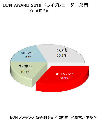 【BCN AWARD 2019・喜びの声】 BCNは1月18日、東京・有楽町の東京国際フォーラムで、IT・デジタル家電の年間販売数量No.1メーカーを表彰する「BCN AWARD 2019」を開催した。集計対象期間は2018年1月1日~12月31日。3年前に新設した「ドライブレコーダー部門」は、2年連続でコムテックが受賞した。