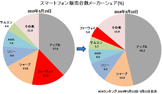 全国の家電量販店やECショップからPOSデータを集計する「BCNランキング」で、スマホにおける日次の販売台数シェアを集計したところ、問題発生直前の5月15日に15.3%でアップルに次ぐ2位だったファーウェイのシェアが、直近の5月22日に5.0%と3分の1に縮小したことが分かった。
