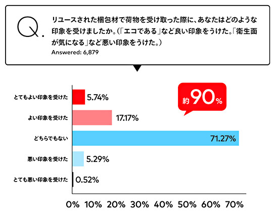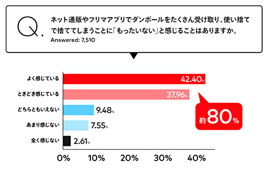 荷物の配送量と比例して消費量が増える段ボールや緩衝材などの梱包材。メルカリの調査によると、梱包材の消費・廃棄を「もったいない」と感じる人は全体の約8割。購入した商品の梱包材が再利用でも気にしないという人に関しては9割にのぼったという。