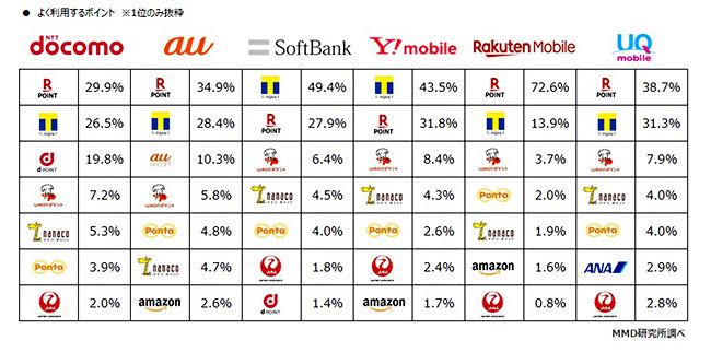 男女6000人のうち、ポイントサービスを利用していると回答した5826人に、対象に、最も利用するポイントサービスの順位を聞いたところ、ドコモ、au、、楽天モバイル、UQ mobileのユーザーが「楽天スーパーポイント」、ソフトバンクとY!mobileのユーザーが「Tポイント」と回答したという。