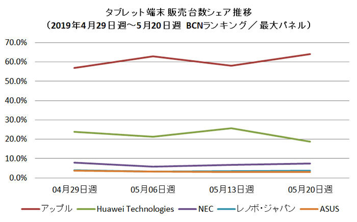 5月各週のメーカー別販売台数シェアでは、アップルが60%前後で推移し、安定のトップをキープ。米国による禁輸措置を受けているファーウェイはスマートフォンでシェアに大きな影響が出ているが、タブレット端末では影響の程度は小さく、20%前後のシェアで2位を死守している。