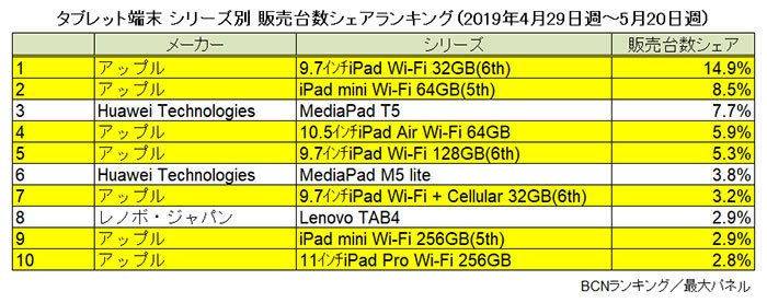 5月のタブレット販売動向、iPadで一番の人気モデルは?