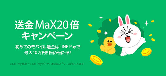 LINE Payは、モバイル送金・決済サービス「LINE Pay」で「送金MaX20倍キャンペーン」を開催する。期間は、6月10日8時30分から22日23時59分まで。