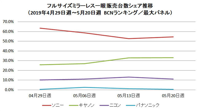 全国の家電量販店やECショップでPOSデータを集計する「BCNランキング」によると、4月のフルサイズミラーレス一眼の販売台数伸び率は、前年同月比で169.6%と伸長。GW(ゴールデンウィーク)10連休で消費が喚起されたこともあり、大きく数字を伸ばした。