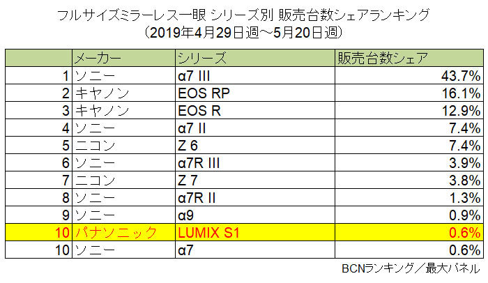 シリーズ別販売台数シェアでは、ソニーの「α7 III」が1位をキープ。4月(4月1日週~4月22日週)は38.9%だったが、5月は43.7%と4.8ポイント上昇。注目したいのは、10位にランクインしたパナソニックの「LUMIX S1」だ。