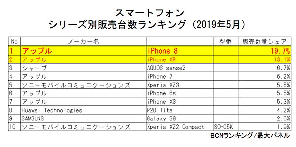 全国の家電量販店・ネットショップのPOSデータを集計する「BCNランキング」によると、5月にもっとも売れたスマートフォン(スマホ)は、Appleの「iPhone 8」だった。シェア値は19.7%。2位の「iPhone XR」と6.6ポイント差で首位についた。