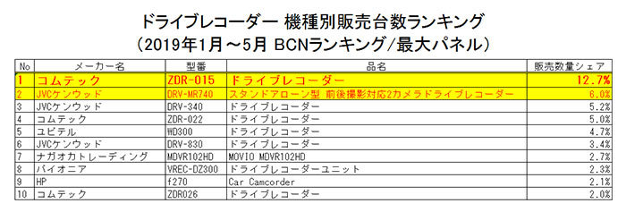 2位についたJVCケンウッドの「DRV-MR740」も、前後撮影対応2カメラドライブレコーダーだ。言うまでもないが、リアカメラ搭載タイプはフロントカメラ単体の製品よりも単価が高い。リアカメラ搭載タイプが売れるようになれば、平均単価も上がっていく。実際に1年前と比べると、2000~3000円ほど単価が上がってきた。