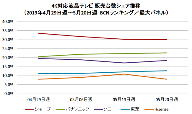 メーカー別では、長らくトップを維持しているシャープが30%を超えるシェアで推移。後半に、シャープ、ソニー、ハイセンスが若干沈み、パナソニックと東芝が数字を伸ばしたが、各社の順位は昨月と変わらない。最も差が詰まっているのは、パナソニックとソニーの2位争い。新製品が本格的に展開される6月以降のシェア争いは要注目だ。