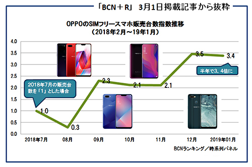 OPPOについては、今年3月に全国の家電量販店やECショップのPOSデータを集計する「BCNランキング」で“成長率No.1”(対象期間は18年7月~19年1月の半年間)を記録したことをお伝えした。販売台数は半年間で約3.4倍。参入からわずか1年で大きく数字を伸ばした。