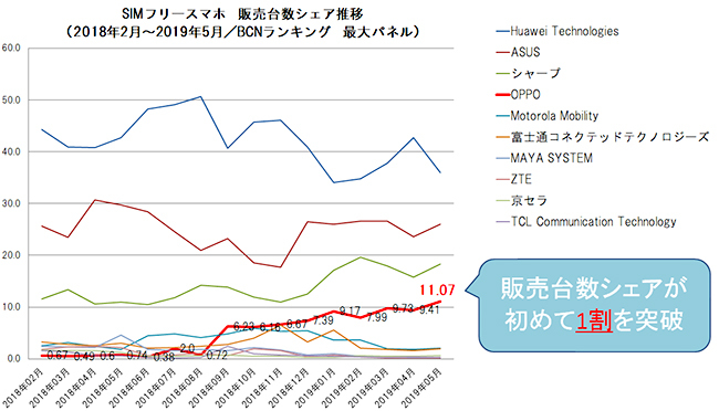 長らくファーウェイ、ASUS、シャープの3社がシェアの大部分を占めていたSIMフリースマートフォン(スマホ)市場に変化の兆しがある。第4勢力として2018年2月に国内市場に参入したOPPOが台頭しつつあるのだ。19年5月の販売台数シェアでは同社として初めて10%を突破。月を追うごとに支持を拡大させている。