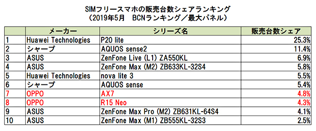 販売台数シェアランキングで上位に食い込むシリーズも増えてきている。19年3月は5月はベストテンに「AX7」と「R15 Neo」の2モデルがランクイン。他の上位モデルも順位を上げてきている。コストパフォーマンスやデザイン性、カメラをはじめとした独自性の高さが徐々に市場に認められつつある。