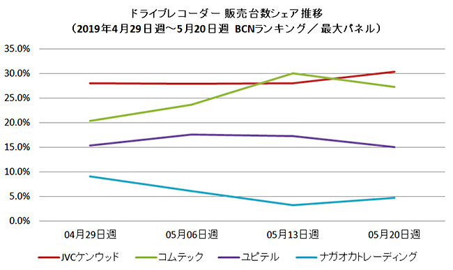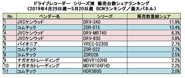5月の各週のメーカー別販売台数シェアでは、JVCケンウッドとコムテックが競り合う展開となった。前半こそJVCが優位に立ったが、コムテックが3週以降は猛追。シェア30%前後でもみ合っている状況だ。同期間のシリーズ別販売台数シェアでは、JVCケンウッドの「DRV-340」が11.9%のシェアで1位を獲得。フルHDの高精細な液晶ディスプレイや自車位置情報を測るGPS機能など、基本をしっかり押さえながら購入しやすい価格帯であることが人気につながった。