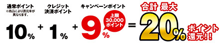 具体的には通常の10%ポイント還元(商品により還元率が異なる)にクレジット決済による1%のポイント還元と今回の9%のキャンペーンポイントが加わると、合計で最大20%のポイント還元が受けられる。