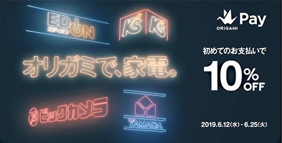 6月5日にビックカメラグループ、6月12日にヤマダ電機グループで利用可能になったOrigami Pay。、6月12日からOrigami Payで決済した場合に初回のみ10%オフ(割引上限3000円)になる「オリガミで、家電。」を開始した。期間は6月25日まで。