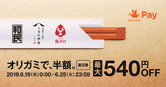 Origami Payは6月13日、「オリガミで、半額。」第8弾の詳細も発表。「和民」「坐・和民」「ミライザカ」「三代目鳥メロ」の店舗で、会計金額から各店舗の人気メニューが半額になるキャンペーンを実施する。最大割引金額は540円。期間は6月19~25日。