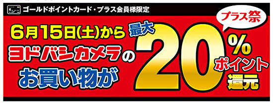 ヨドバシカメラは6月15日、最大20%ポイント還元の「ゴールドポイントカード・プラスでキャッシュレス決済キャンペーン」を開始した。ヨドバシカメラ全店やネット直販のヨドバシ・ドット・コムで同社の年会費・入会金無料のクレジットカード「ゴールドポイントカード・プラス」のクレジット決済で支払うと、最大20%のヨドバシゴールドポイントを還元する。