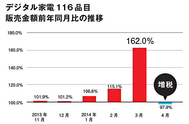 全国の家電量販店やECショップのPOSデータを集計する「BCNランキング」によると、デジタル家電116品目の販売金額前年同月比は5か月前の11月から上昇。直前の3月には162.0%をマークした。増税の駆け込みがいかにインパクトがあるかが分かる。