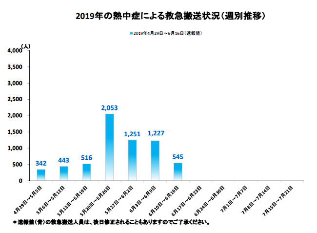 総務省消防庁が発表している熱中症情報によると、6月10~16日の1週間に全国で熱中症で救急搬送された人数は545人。前週の1227人を大幅に下回った。