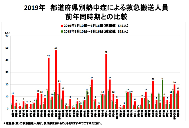 梅雨入りとともに暑さが和らぎ、熱中症による救急搬送数は半減したが、前年同期比で220人ほど多く、地域別では都市部を中心に前年の2倍以上の救急搬送数を記録。特に、東京都と大阪府では約4倍に上った。