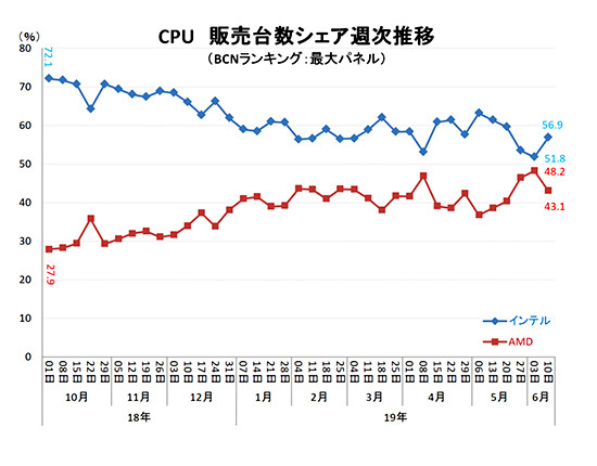 インテルのパーツ単体としてのCPUの販売台数シェアがジリジリと下がっている。全国の主要家電量販店・ネットショップのPOSデータを収集した「BCNランキング」週次データによると、2018年10月1日週に72.1%あったシェアは、19年6月3日週に51.8%まで下がっている。一方でライバルのAMDの同期間のシェアは27.9%から48.2%まで上昇。インテルとの差がわずか3.6ポイントになるまで詰め寄った。いったい、何が起きてるのか。