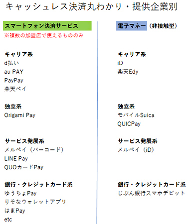 iPhoneとAndroidスマホの両方もしくはどちらかで利用できる、主要なスマホ決済サービスを提供企業の主力事業・成り立ち別に分類すると、おおむね「キャリア系」「独立系」「サービス発展系」「銀行・クレジットカード系」に分かれる。
