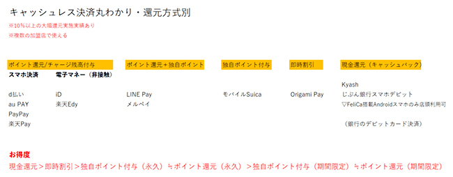主要なスマホ決済サービスを、還元方式別に分類すると、圧倒的に「ポイント還元」が多い。即時割引のスマホ決済は「Origami Pay」だけ。なお、すでに終了しているが、「じぶん銀行スマホデビット」の「じぶん銀行スマホデビット新規発行&ご利用キャンペーン」は、5月7日から23日までのキャンペーン期間中、支払額に応じ、最大20%を現金でキャッシュバックするという内容だった(詳細はこちら→https://www.bcnretail.com/news/detail/20190516_119017.html)。各スマホ決済サービスの還元率が全く同じと仮定すると、お得度は「現金還元(口座振り込み)>即時割引>独自ポイント付与(永久)≒ポイント還元(永久)>独自ポイント付与(期間限定)≒ポイント還元(期間限定)」の順。期間限定ポイントだと、使い忘れて消える可能性があり、一定の比率で使われずに消滅しているからこそ、大幅ポイント還元キャンペーンが成立していると考えられる。