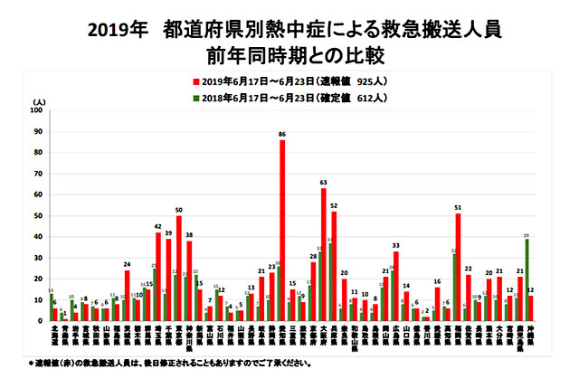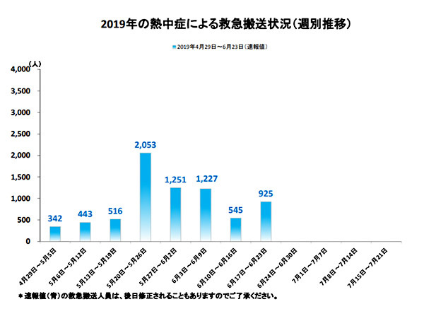 総務省消防庁が発表している熱中症情報によると、6月17~23日の1週間に全国で熱中症で救急搬送された人数は925人。前週の545人から大幅に伸長した。