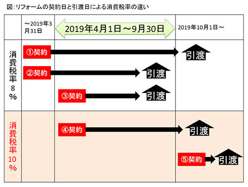 図は、「契約日と引渡日による消費税率の違い」を表したもの。2019年3月31日以前の「契約」、4月1日以後の「契約」で9月30日までに「引渡」の案件は消費税率が8%である。