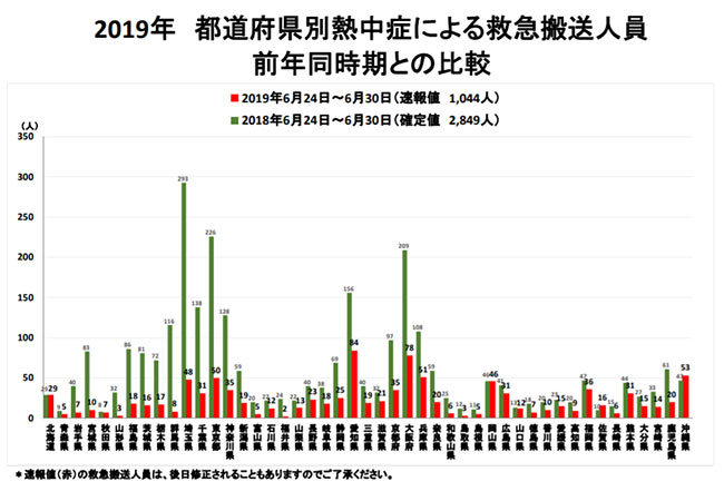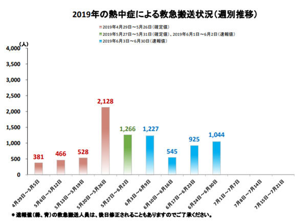 総務省消防庁が発表している熱中症情報によると、6月24~30日の1週間に全国で熱中症で救急搬送された人数は速報値で1044人。前週の925人から微増したものの、前年比では半減した。