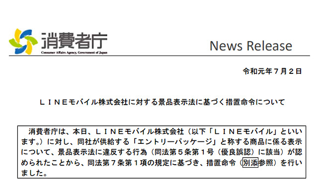 消費者庁は7月2日、MVNOサービスを提供するLINEモバイルに対し、景品表示法違反で再発防止を求める措置命令を出した。