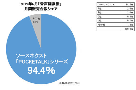ソースネクストは7月4日、AI翻訳機「POCKETALK(ポケトーク)」シリーズが、全国の主要家電量販店・ネットショップのPOSデータを集計した「BCNランキング」2019年6月の「音声翻訳機」部門で、メーカー別販売台数シェア94.4%を獲得し、トップになったと発表した。