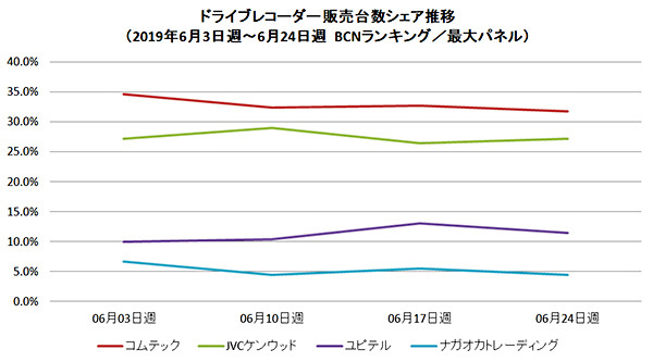 全国の家電量販店やECショップでPOSデータを集計する「BCNランキング」によると、6月のドライブレコーダーの販売台数は前年同月比で107.8%と伸長した。メーカー別では、ツートップのコムテックとJVCケンウッドに人気が集中。コムテックが前年同月比113.4%、JVCケンウッドが174.1%と、大きく成長している。