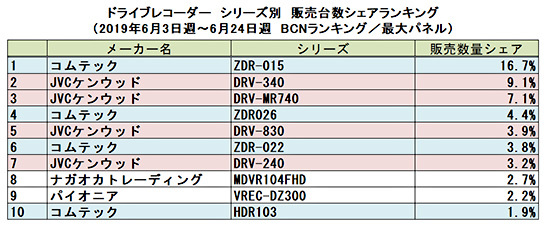 同期間中の販売台数シェアランキングでは、コムテックの「ZDR-015」が16.7%の高いシェアで1位。2位にJVCケンウッドの「DRV-340」、3位に同社の「DRV-MR740」が続いた。前後2カメラタイプの需要が増していることは各メディアでも報道されているが、ランキングもそれを反映した結果になっている。