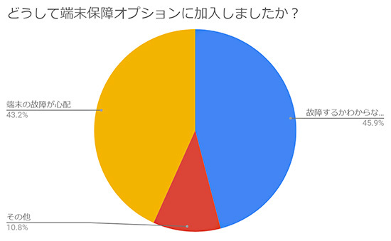加入の理由は「故障するかわからないが、念のため」(45.9%)、「端末の故障が心配」(43.2%)など、やはり念のために加入するケースが多い。実際に端末保障オプションを利用したユーザーは13.2%と低かった。