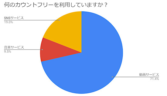 1番多かったのカウントフリーは、「動画サービス」で71.4%。次いで、「SNSサービス」が19%、「音楽サービス」が9.5%となった。