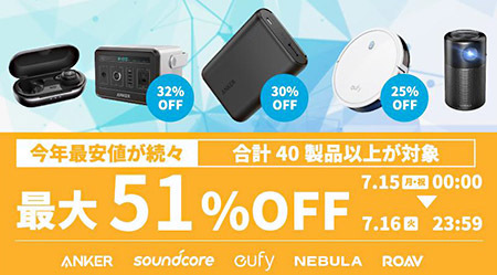 アンカー・ジャパン(Anker)は、7月16日23時59分まで開催のAmazonの「プライムデー」で40製品以上をそろえ、最大51%オフで販売している。