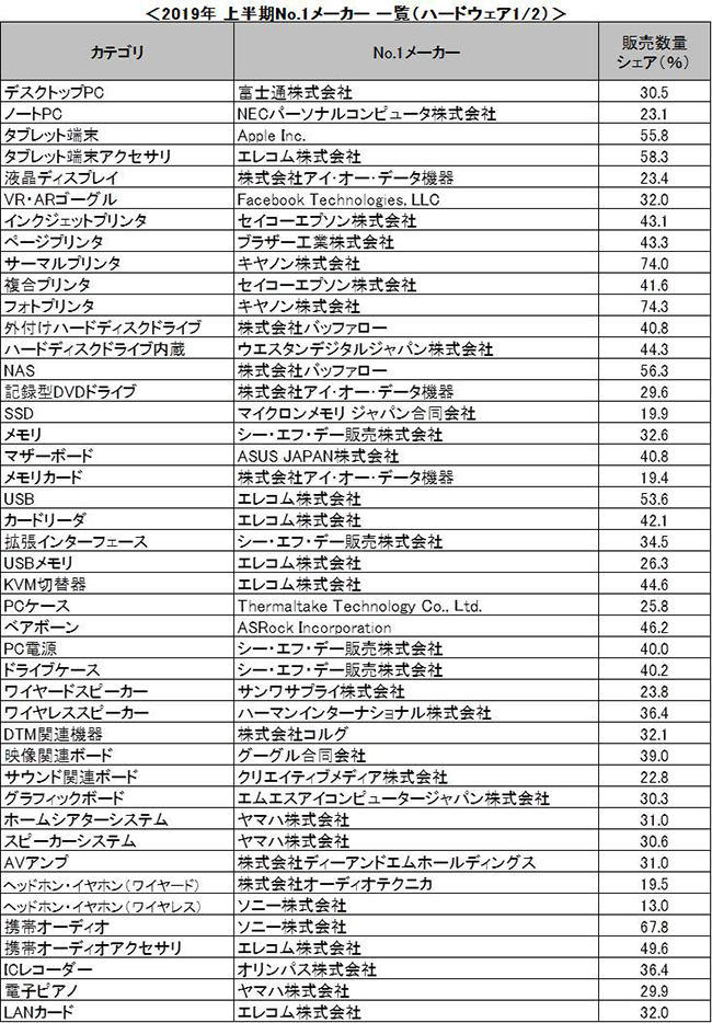 BCNは7月16日、デジタル家電の実売データを集計する「BCNランキング」に基づき、主要な117のカテゴリ(ハードウェア85、ソフトウェア32)について、2019年上半期(1月-6月)に最も販売数が多かった「上半期No.1メーカー」を発表した。
