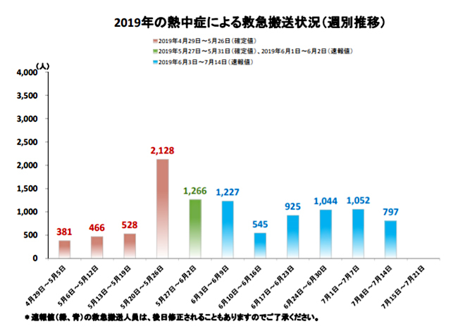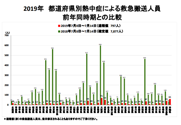 総務省消防庁が発表している熱中症情報によると、7月8~14日の1週間に全国で熱中症によって救急搬送された人数は速報値で797人。前週の1052人から減少に転じた。昨年同期間では7877人(確定値)が救急搬送されており、前年比で10分の1程度となった。