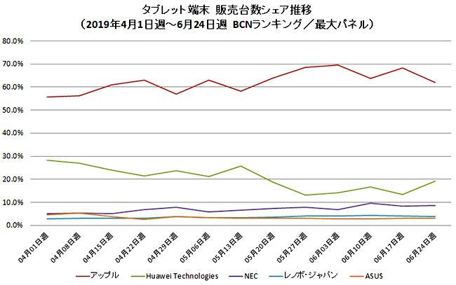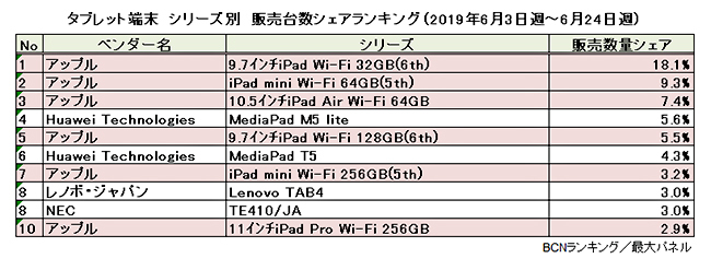 Androidタブレットでは、長らくトップに君臨していたファーウェイの「MediaPad T5」に代わって、同社が5月に発売した「MediaPad M5 lite」が首位に立った。コンパクトな8インチモデルであることに加えて、リーズナブルな価格で高機能・高音質を実現しており、新たな定番モデルとして期待がもてそうだ。(BCN・大蔵 大輔)