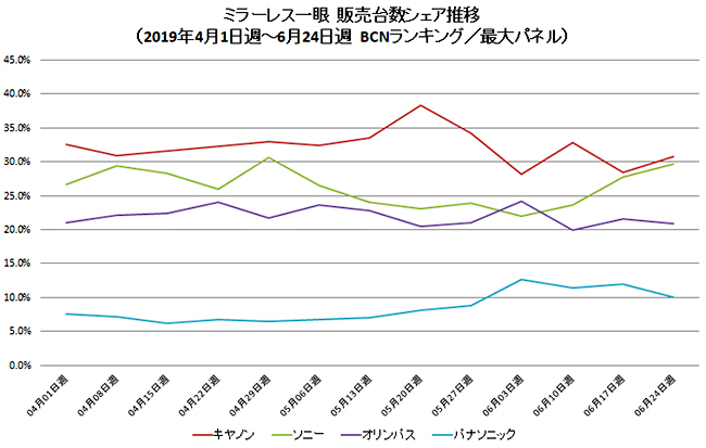 フルサイズモデルに関しては、発売日が未定であるものの、7月11日にシグマが世界最小・最軽量の「SIGMA fp」、7月17日にソニーが6100万画素センサー搭載の「α7R IV」を発表。画期的な製品のリリースが控えており、下半期はさらに市場が盛り上がりそうだ。(BCN・大蔵 大輔)