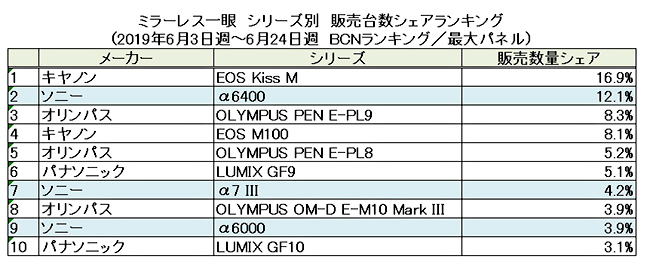 同期間のシリーズ別販売台数ランキングでは、発売以来、高い人気を誇っているキヤノンの「EOS Kiss M」が首位をキープ。ただ、2月に発売したソニーの「α6400」が猛追しており、その差は4.8ポイントに縮まっている。ソニーは、7位に高単価のフルサイズ機「α7 III」もランクインしている。