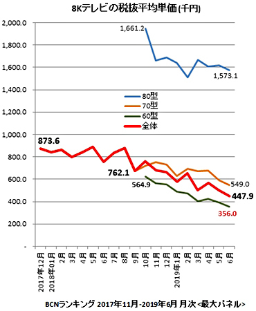8Kテレビは、今のところシャープが販売している液晶テレビ5機種しかないものの、全体で見ても当初に比べて価格が大幅に下がっている。平均単価は17年11月の86万7400円から、この6月で44万7900円とほぼ半値になった。当初、70型のみだったが、60型、80型とバリエーションも増え、昨年11月にチューナー搭載モデルも登場した。