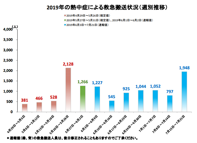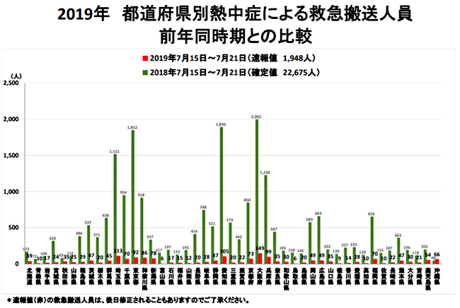 総務省消防庁が発表している熱中症情報によると、7月15日~7月21日の1週間に全国で熱中症で救急搬送された人数は速報値で1948人。前週の797人から大幅に増加し、2.4倍の数値を記録した。ただ、昨年の同期間では11倍の2万2575人(確定値)が救急搬送されており、例年を下回り続けている。