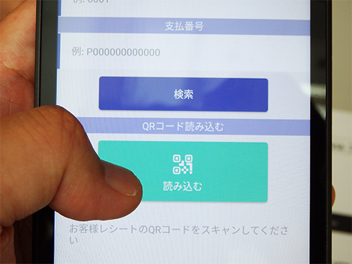 顧客のレシートのQRコードを読み込むボタンを押すと、決済のときと同じようなQRコードを読み取るためのカメラが立ち上がる。そして、レシートの返金用のQRコードを読み込む。なお、QRコードが読み込めないときは、レシートの支払番号から検索することもできるようになっている。